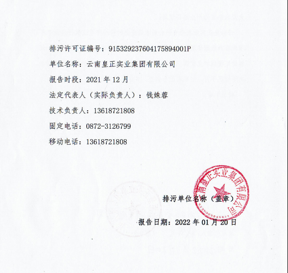 云南皇正實業(yè)集團有限公司環(huán)境信息公開表2021年度