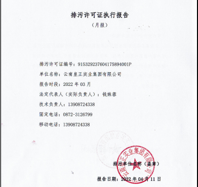 云南皇正實業(yè)集團有限公司4月排污許可執(zhí)行報告
